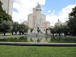 セルバンテスを記念して造られた広場で、セルバンテス像が、ドンキホーテとサンチョパンサを見下ろすように立っている。